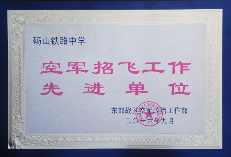 我校在2016年空军招飞工作中表现突出,取得了优异成绩,陈俊杰、许国政、张宁三位同学同时被中国人民解放军空军航空大学录取。因此我校被东部战区空军政治工作部授予“空军招飞工作先进单位”称号,我校将在2017年空军招飞工作中继续努力,为空军输送更多的优秀人才。