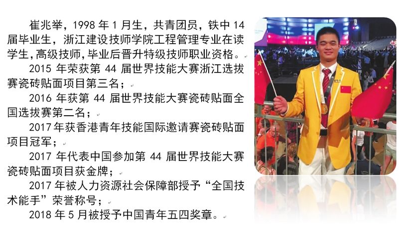 聆听了崔兆举同学的报告和各位领导的讲话,他们的报告和讲话给在座的全体师生以深深的教育和启迪。在今后的工作和学习中,我们要进一步解放思想,转变观念,我们坚信,人人都是才,人人能成才;三百六十行,行行出状元。培养一技之长,争当大国工匠,同样能成就精彩人生,同样能为国家争光,为社会做贡献!希望全体同学能以崔兆举同学为榜样,向崔兆举同学学习,学习他那种刻苦钻研的精神,学习他那种精益求精的精神,学习他那种勇争第一为国争光的精神。同学们只有把以上精神落实到平时学习中去,勤奋惜时,才能做一个新时代的优秀青年。