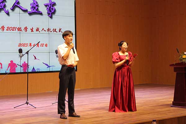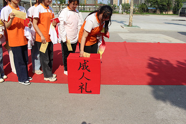 各班正、副班主任给学生分发、佩戴成人纪念章和《中华人民共和国宪法》,鼓励他们不断学习,承担责任,不负时代,奋斗拼搏。全体学生手持宪法,面向国旗,庄严宣誓:“家庭将因我而更加幸福,校园将因我而更加和谐,祖国将因我而更加繁荣昌盛! 天地为鉴,国旗为证,十八而志,青春万岁!”立志成为中国特色社会主义合格建设者和可靠接班人。整个仪式高潮迭续,音乐生领唱、全体学生合唱的励志歌曲《怒放的生命》,将活动推向又一高潮。