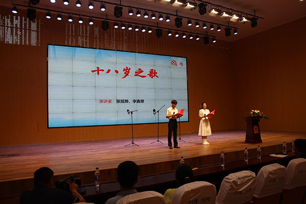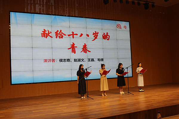 开场节目学生“炫响”组合献上诗朗诵《十八岁之歌》,他们自信地宣告:“今天,学校因我们而和谐美丽;明天,世界将因我们而无限精彩!”语文组侯志奇、赵淑文、王晶、毛倩四位老师联袂进行配乐诗朗诵,以为激励和呼应:“为了昨天的纯真,为了今天的责任,为了明天的理想,希望你们阔步成长,一起举手托起明天的太阳!”两组朗诵和而不同,相映生辉,以不同的身份,从不同的视角诠释了十八岁的内涵,阐释了成人礼的意义,成为开场的两道靓丽风景线。