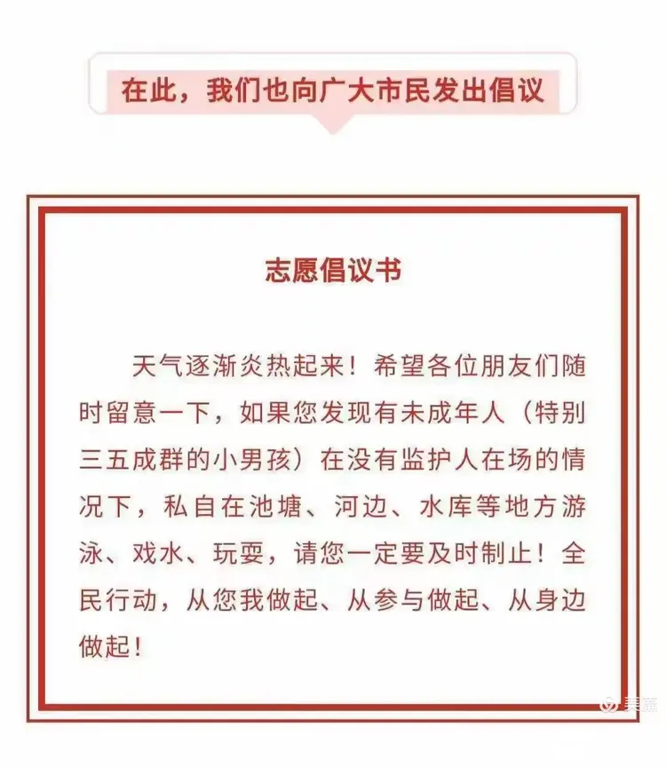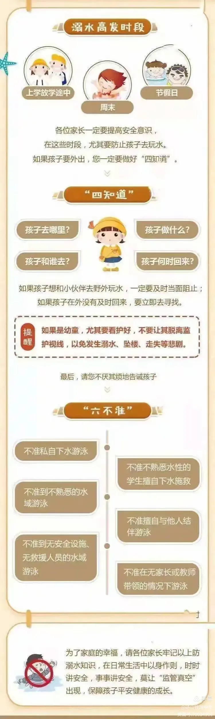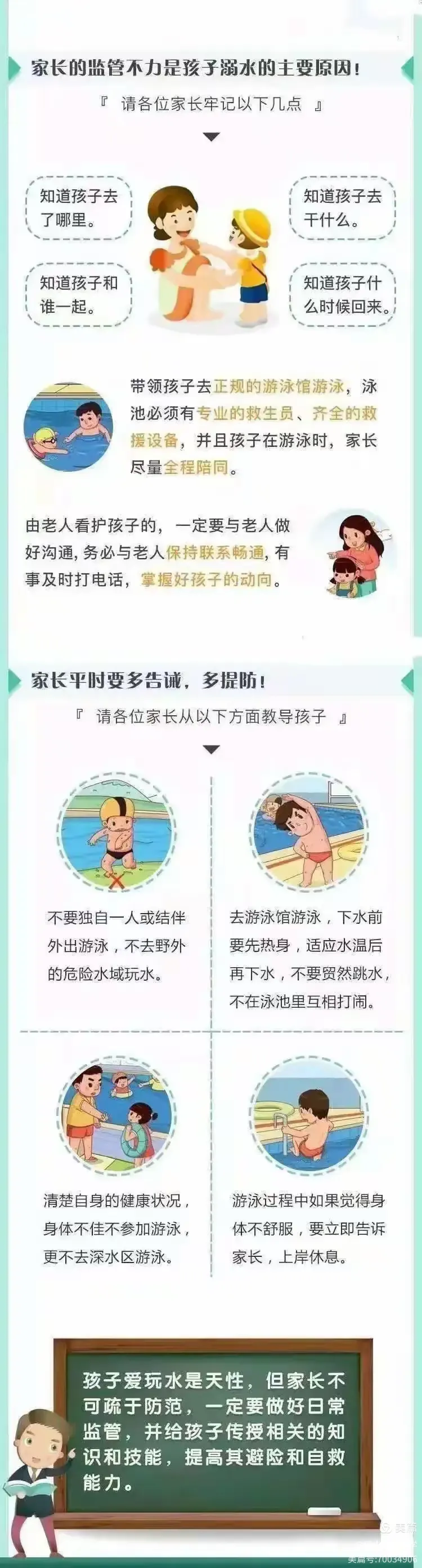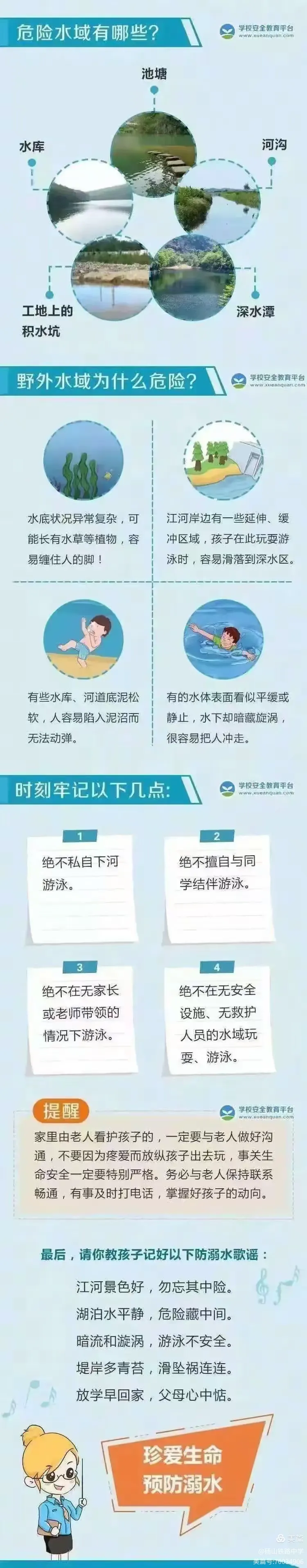 天气逐渐炎热,防溺水教育刻不容缓,各位家长一定要常提醒、常教育、常关注,加强放学后、周末、节假日期间孩子结伴外出游玩时的管理,防止孩子因溺水而发生意外,防止悲剧发生。