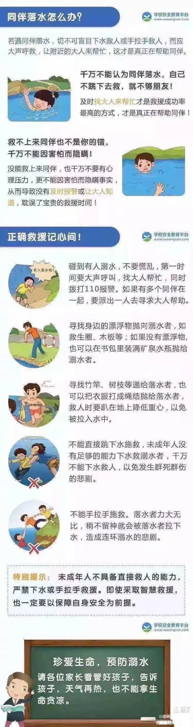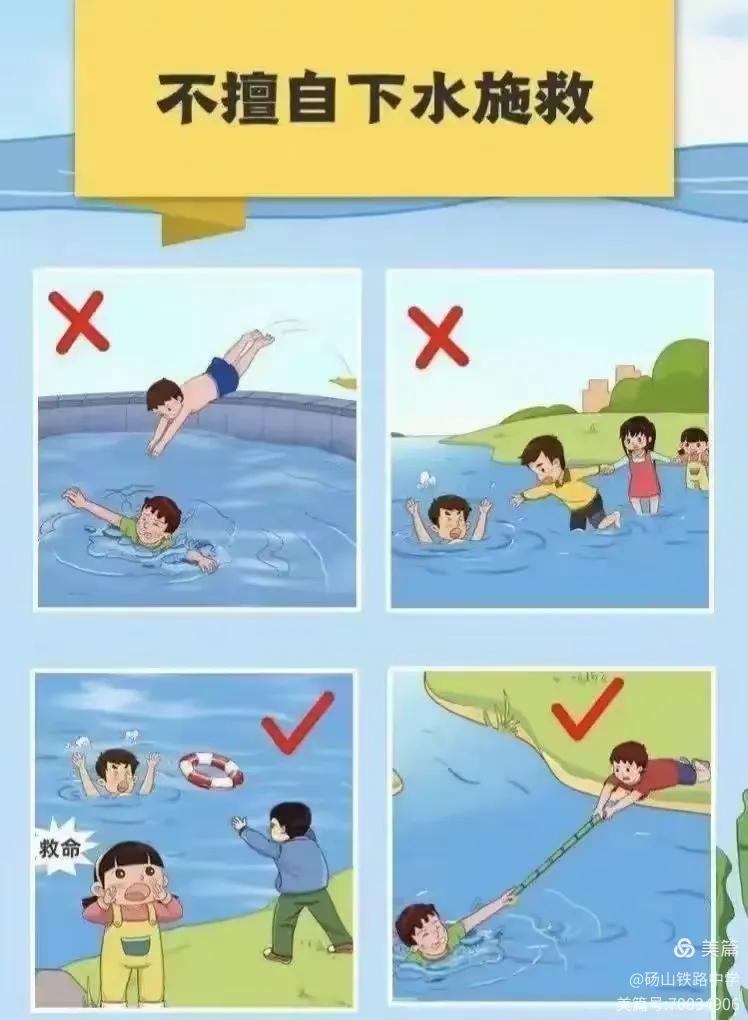 若遇同伴落水,切不可盲目下水救人或手拉手救人,而应大声呼救,让附近的大人来帮忙,这才是真正在帮助同伴。
