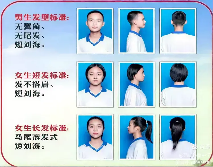 1.仪容仪表管理。请按照学校要求进行自查,男同学不留长发,不剃光头,不染发、烫发,不理碎发;女同学不染发、烫发,不得佩戴饰物,不得化妆或涂指甲。全体学生穿戴整洁、朴素、大方,不穿奇装异服。附图: