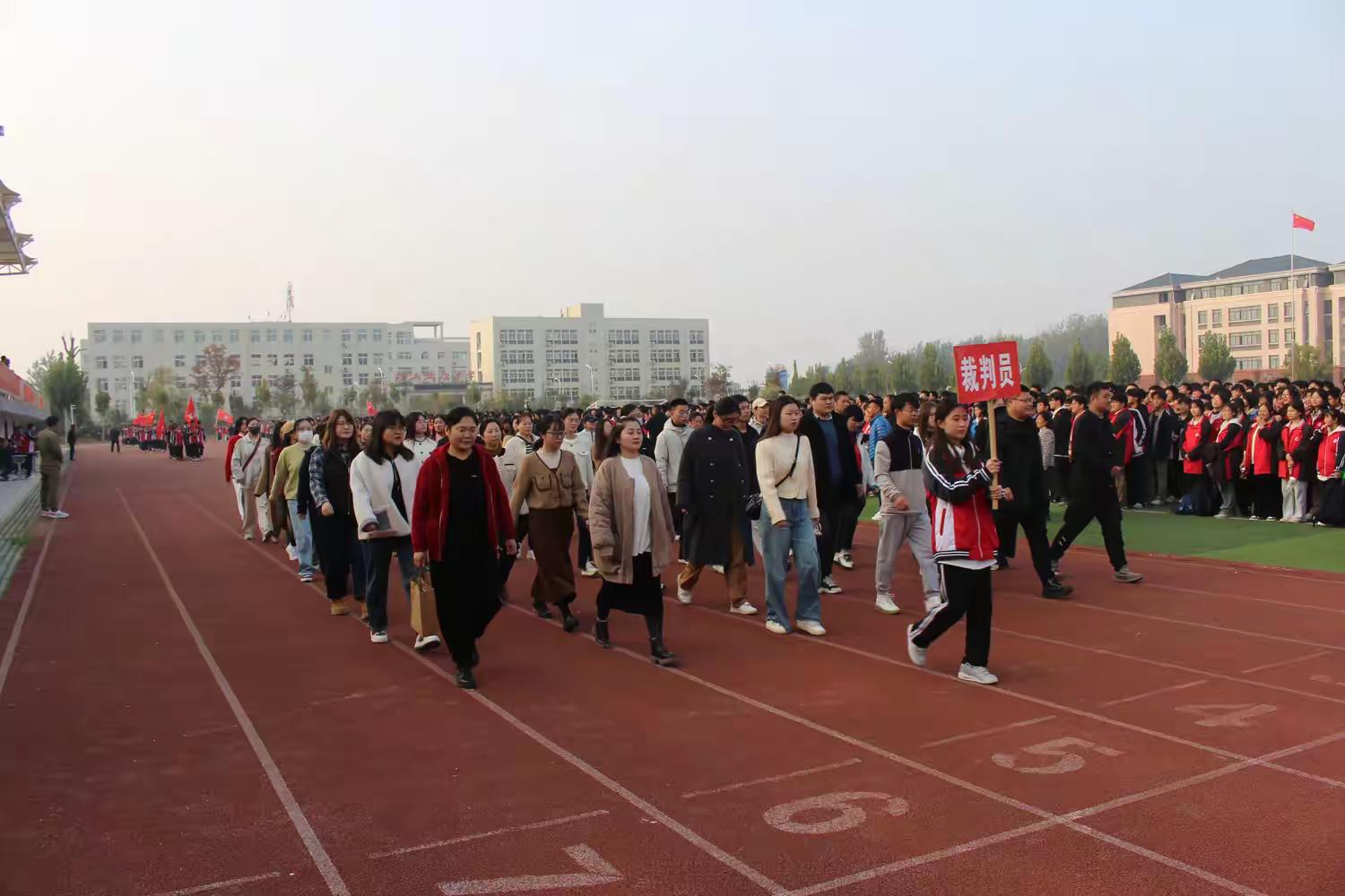 在全场学生的欢呼呐喊声中,由高一、高二、高三三个年级组的老师,组成的裁判员方队闪亮登场!这支脚踏实地、默默耕耘的和谐团队,这支拼搏进取、不懈追求的中坚力量,浇灌了满园硕果,铸就了砀山铁路中学高中部多年教育的辉煌篇章!