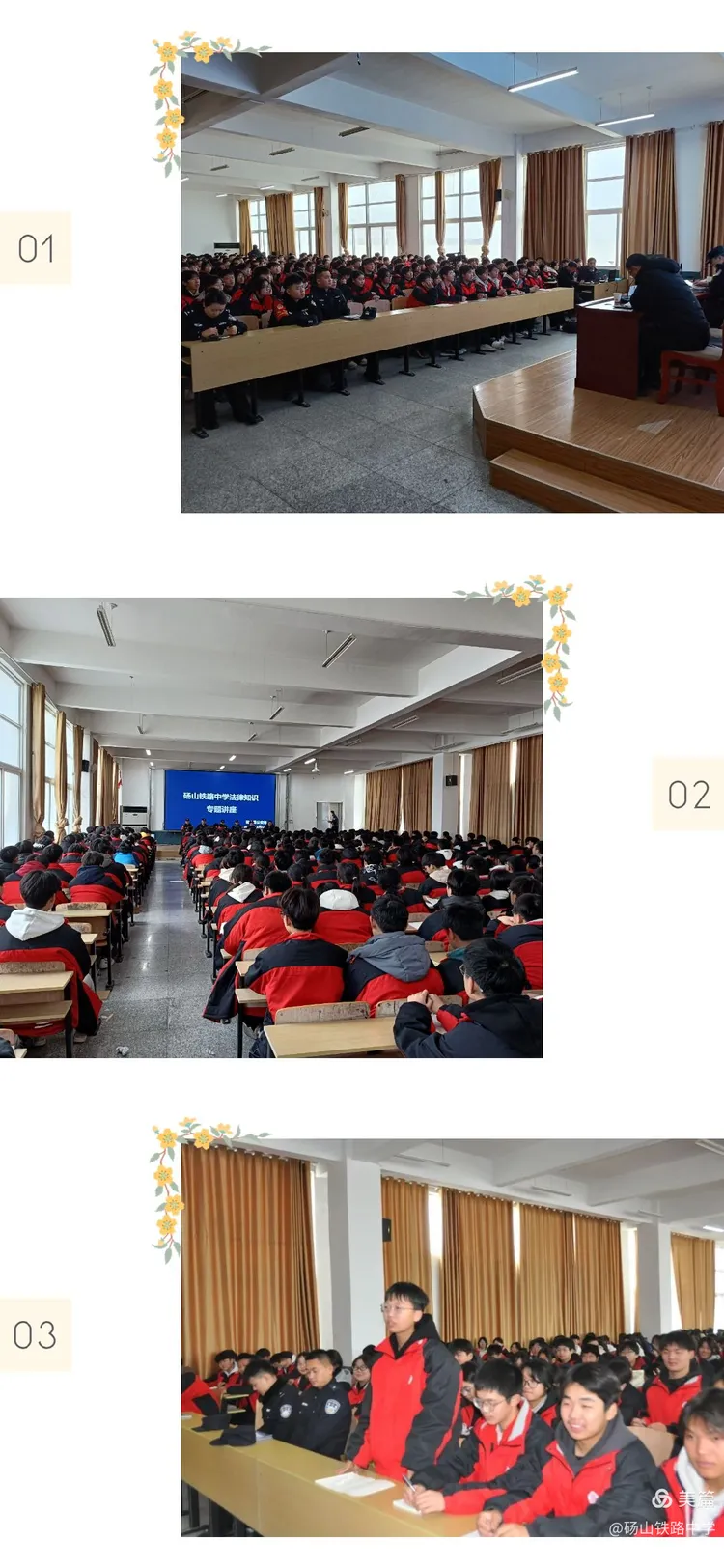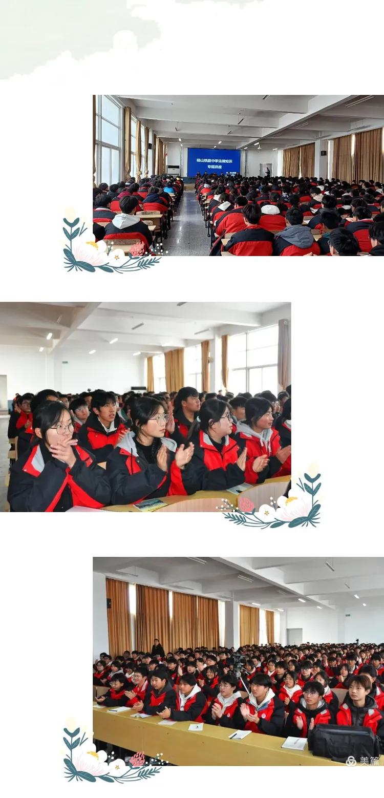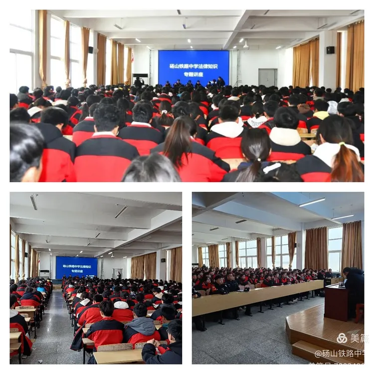 为了培养学生的法治意识,增强法制观念,预防未成年人犯罪,促进学生的健康成长,20241210日上午,砀山铁路中学高中部,举办法律知识专题讲座。近600名高一新生聚集在六楼会议室聆听来自县公安局警官的报告。